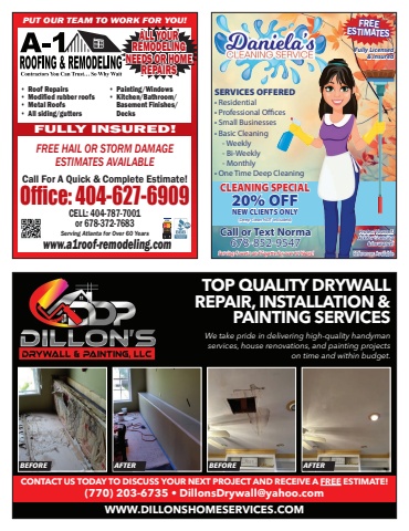 WWW.DILLONSHOMESERVICES.COMTOP QUALITY DRYWALL REPAIR, INSTALLATION & PAINTING SERVICESWe take pride in delivering high-quality handyman services, house renovations, and painting projects on time and within budget.BEFORE AFTER BEFORE AFTERCONTACT US TODAY TO DISCUSS YOUR NEXT PROJECT AND RECEIVE A FREE ESTIMATE!(770) 203-6735 %u2022 DillonsDrywall@yahoo.comCall For A Quick & Complete Estimate!CELL: 404-787-7001or 678-372-7683PUT OUR TEAM TO WORK FOR YOU!ALL YOUR REMODELINGNEEDS OR HOME REPAIRSServing Atlanta for Over 60 Years www.a1roof-remodeling.comFREE HAIL OR STORM DAMAGEESTIMATES AVAILABLEOffice: 404-627-6909FULLY INSURED!%u2022 Roof Repairs%u2022 Modified rubber roofs%u2022 Metal Roofs%u2022 All siding/gutters%u2022 Painting/Windows%u2022 Kitchen/Bathroom/Basement Finishes/DecksCall or Text Norma678-852-9547SERVICES OFFERED%u2022 Residential%u2022 Professional Offices%u2022 Small Businesses%u2022 Basic Cleaning- Weekly - Bi-Weekly - Monthly%u2022 One Time Deep CleaningCLEANING SPECIAL20% OFFNEW CLIENTS ONLY(Deep Clean NOT Included)FREE ESTIMATESFully Licensed & Insured Serving Coweta and Fayette for over 10 Years! References AvailableProtect Yourself. Ask for Licensing & Insurance!