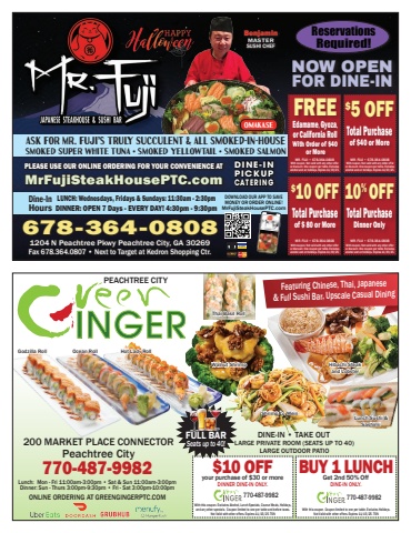 Freshest Sushi & Hibachi in Town! BenjaminMASTER SUSHI CHEFFREEEdamame, Gyoza,or California RollWith Order of $40 or More MR. FUJI %u2022 678.364.0808 With coupon. Not valid with any other offer or discount. One coupon per table. Excludes alcohol and on holidays. Expires 11/30/25.$5 OFFTotal Purchaseof $40 or More10% OFFTotal PurchaseDinner OnlyMR. FUJI %u2022 678.364.0808 With coupon. Not valid with any other offer or discount. One coupon per table. Excludes alcohol and on holidays. Expires 11/30/25.$10 OFFTotal Purchaseof $ 80 or MoreDOWNLOAD OUR APP TO SAVEMONEY OR ORDER ONLINE!MrFujiSteakHousePTC.comReservationsRequired!NOW OPEN FOR DINE-IN678-364-08081204 N Peachtree Pkwy Peachtree City, GA 30269Fax 678.364.0807 %u2022 Next to Target at Kedron Shopping Ctr.DINE-INPICKUPCATER INGAsk For Mr. Fuji%u2019s Truly Succulent & all smoked-in-housesMoked super White tuna %u2022 sMoked YellowtAil %u2022 sMoked sAlMonLUNCH: Wednesdays, Fridays & Sundays: 11:30am - 2:30pmDINNER: OPEN 7 Days - EVERY DAY! 4:30pm - 9:30pmoMaKaseDine-In HoursPLEASE USE OUR ONLINE ORDERING FOR YOUR CONVENIENCE ATMrFujiSteakHousePTC.comMR. FUJI %u2022 678.364.0808 With coupon. Not valid with any other offer or discount. One coupon per table. Excludes alcohol and on holidays. Expires 11/30/25.MR. FUJI %u2022 678.364.0808 With coupon. Not valid with any other offer or discount. One coupon per table. Excludes alcohol and on holidays. Expires 11/30/25.With this coupon. Excludes Alcohol, Lunch Specials, Course Meals, Holidays, and any other specials. Coupon limited to one per table and before taxes. Not Valid with other offers. Expires 11/15/25. TSN770-487-9982your purchase of $30 or moreDINNER DINE-IN ONLY.$10 OFFDINE-IN %u2022 TAKE OUT770-487-9982Lunch: Mon - Fri 11:00am-3:00pm %u2022 Sat & Sun 11:00am-3:00pmDinner: Sun - Thurs 3:00pm-9:30pm %u2022 Fri - Sat 3:00pm-10:00pmONLINE ORDERING AT GREENGINGERPTC.COMLARGE PRIVATE ROOM (SEATS UP TO 40)LARGE OUTDOOR PATIOWith this coupon. Coupon limited to one per table. Excludes Holidays. Not Valid with other offers. Expires 11/15/25. TSN770-487-9982Get 2nd 50% OffDINE-IN ONLY.BUY 1 LUNCHWalnut ShrimpThai Basil RollFeaturing Chinese, Thai, Japanese& Full Sushi Bar, Upscale Casual DiningPEACHTREE CITYLunch Sushi & SashimiHibachi Steakand LobsterGodzilla Roll Ocean RollShrimp Lo MeinHot Lady Roll200 MARKET PLACE CONNECTORPeachtree CityFULL BAR Seats up to 40!