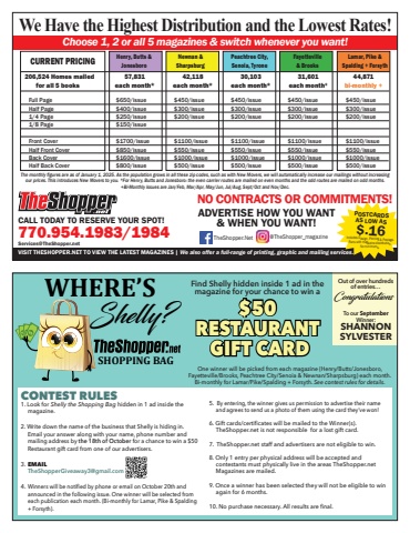 We Have the Highest Distribution and the Lowest Rates!Choose 1, 2 or all 5 magazines & switch whenever you want!Services@TheShopper.netThe monthly figures are as of January 1, 2025. As the population grows in all these zip codes, such as with New Movers, we will automatically increase our mailings without increasing our prices. This introduces New Movers to you. *For Henry, Butts and Jonesboro: the even carrier routes are mailed on even months and the odd routes are mailed on odd months. +Bi-Monthly issues are Jan/Feb, Mar/Apr, May/Jun, Jul/Aug, Sept/Oct and Nov/Dec.VISIT THESHOPPER.NET TO VIEW THE LATEST MAGAZINES | We also offer a full-range of printing, graphic and mailing services.CALL TODAY TO RESERVE YOUR SPOT!770.954.1983/1984ADVERTISE HOW YOU WANT & WHEN YOU WANT! $.16POSTCARDS AS LOW ASIncludes Design, Printing & Postage. Runs with magazine distribution. No minimums.TheShopper.Net @TheShopper_magazineNO CONTRACTS OR COMMITMENTS! Henry, Butts & Newnan & Peachtree City, Fayetteville Lamar, Pike & CURRENT PRICING Jonesboro Sharpsburg Senoia, Tyrone & Brooks Spalding + Forsyth 206,524 Homes mailed 57,831 42,118 30,103 31,601 44,871 for all 5 books each month* each month* each month* each month* bi-monthly +Full Page $650/issue $450/issue $450/issue $450/issue $450/issue Half Page $400/issue $300/issue $300/issue $300/issue $300/issue 1/4 Page $250/issue $200/issue $200/issue $200/issue $200/issue 1/8 Page $150/issue Front Cover $1700/issue $1100/issue $1100/issue $1100/issue $1100/issue Half Front Cover $850/issue $550/issue $550/issue $550/issue $550/issue Back Cover $1600/issue $1000/issue $1000/issue $1000/issue $1000/issue Half Back Cover $800/issue $500/issue $500/issue $500/issue $500/issue1. Look for Shelly the Shopping Bag hidden in 1 ad inside the magazine. 2. Write down the name of the business that Shelly is hiding in. Email your answer along with your name, phone number and mailing address by the 18th of October for a chance to win a $50 Restaurant gift card from one of our advertisers.3. EMAILTheShopperGiveaway3@gmail.com 4. Winners will be notified by phone or email on October 20th and announced in the following issue. One winner will be selected from each publication each month. (Bi-monthly for Lamar, Pike & Spalding + Forsyth).5. By entering, the winner gives us permission to advertise their name and agrees to send us a photo of them using the card they%u2019ve won!6. Gift cards/certificates will be mailed to the Winner(s). TheShopper.net is not responsible for a lost gift card. 7. TheShopper.net staff and advertisers are not eligible to win.8. Only 1 entry per physical address will be accepted and contestants must physically live in the areas TheShopper.net Magazines are mailed.9. Once a winner has been selected they will not be eligible to win again for 6 months.10. No purchase necessary. All results are final.CONTEST RULESWHERE%u2019SShelly?SHOPPING BAGFind Shelly hidden inside 1 ad in the magazine for your chance to win a$50 RESTAURANT GIFT CARDOne winner will be picked from each magazine (Henry/Butts/Jonesboro, Fayetteville/Brooks, Peachtree City/Senoia & Newnan/Sharpsburg) each month. Bi-monthly for Lamar/Pike/Spalding + Forsyth. See contest rules for details.CongratulationsTo our SeptemberWinner:SHANNON SYLVESTEROut of over hundreds of entries%u2026