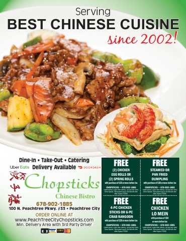 Dine-In %u2022 Take-Out %u2022 CateringDelivery AvailablePlease mention Coupon when ordering. Not valid with Family Dinner Specials. Must present coupon. Not Valid with other offers. Expires 11/30/25.CHOPSTICKS %u2022 678-902-1885FREE(2) CHICKENEGG ROLLS OR(2) SPRING ROLLSwith purchase of $25 or more before taxPlease mention Coupon when ordering. Not valid with Family Dinner Specials. Must present coupon. Not Valid with other offers. Expires 11/30/25.CHOPSTICKS %u2022 678-902-1885FREESTEAMED ORPAN FRIED DUMPLINGwith purchase of $30 or more before taxPlease mention Coupon when ordering. Not valid with Family Dinner Specials. Must present coupon. Not Valid with other offers. Expires 11/30/25.CHOPSTICKS %u2022 678-902-1885FREE4-PC CHICKENSTICKS OR 6-PCCRAB RANGOONwith purchase of $30 or more before taxPlease mention Coupon when ordering. Not valid with Family Dinner Specials. Must present coupon. Not Valid with other offers. Expires 11/30/25.CHOPSTICKS %u2022 678-902-1885FREECHICKENLO MEINwith purchase of $50or more before taxChopsticksfifffflffifl%u001afl%u0019%u0018ffl%u001a%u0017%u0016%u0015678-902-1885100 N. Peachtree Pkwy. #33 %u2022 Peachtree CityORDER ONLINE ATwww.PeachTreeCityChopsticks.comMin. Delivery Area with 3rd Party Driver678-902-1885100 N. Peachtree Pkwy. #33 %u2022 Peachtree CityORDER ONLINE ATwww.PeachTreeCityChopsticks.comMin. Delivery Area with 3rd Party Driver