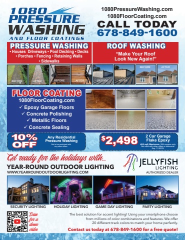 FLOOR COATING1080FloorCoating.com%uf0fc Epoxy Garage Floors%uf0fc Concrete Polishing%uf0fc Metallic Floors%uf0fc Concrete Sealing1080PressureWashing.com1080FloorCoating.comCALL TODAY678-849-1600BEFORE AFTER BEFORE AFTERBEFORE AFTERBEFORE AFTERNot to be combined with any other offers.Any Residential 10% Pressure Washing OFFPRESSURE WASHING%u2022 Houses Driveways %u2022 Pool Decking %u2022 Decks %u2022 Porches %u2022 Fencing %u2022 Retaining Walls %u2022 SidewalksROOF WASHING%u201cMake Your RoofLook New Again!%u201d$2,498 2 Car Garage Flake Epoxy400 sqft Maximum. With coupon only. Not valid with other offers or discounts. Exp. 11/30/25.AUTHORIZED DEALERSECURITY LIGHTING HOLIDAY LIGHTING GAME DAY LIGHTING PARTY LIGHTINGGet ready for the holidays with%u2026YEAR-ROUND OUTDOOR LIGHTINGScan for a demo videoWWW.YEARROUNDOUTDOORLIGHTING.COMThe best solution for accent lighting! Using your smartphone choose from millions of color combinations and features. We offer 20 different track colors to match your home perfectly. Contact us today at 678-849-1600 for a free quote!