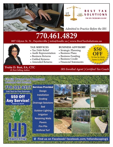 897 Glynn St. N., Fayetteville | info@bsullc.us | www.BestTaxSolutions.usTAX SERVICES%u2022 Tax Debt Relief%u2022 Audit Representation%u2022 Business Returns%u2022 Unfiled Returns%u2022 Amended ReturnsBUSINESS ADVISORY%u2022 Strategic Planning%u2022 Business Plans%u2022 Business Funding%u2022 Business Credit%u2022 Financial Statements770.461.4829Admitted to Practice Before the IRSFor New Tax Clients.Expires 11/30/25$50 OFFYvette D. Best, EA, CTC4X Best Selling Author IRS Enrolled Agent | Certified Tax CoachExpires 11/30/25
