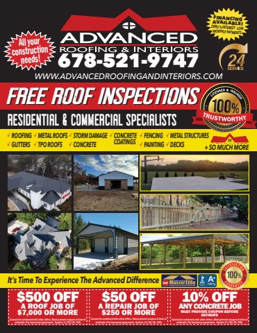 RESIDENTIAL & COMMERCIAL SPECIALISTS A ROOF JOB OF$7,000 OR MORE$500 OFFCannot be combined with other offers. Must present coupon at time of estimate. Per insurance paperwork. Expires 11/30/25. TSN ANY CONCRETE JOB10% OFFCannot be combined with other offers. Must present coupon at time of estimate. Per insurance paperwork. Expires 11/30/25. TSNA REPAIR JOB OF$250 OR MORE$50 OFFCannot be combined with other offers. Must present coupon at time of estimate. Per insurance paperwork. Expires 11/30/25. TSNMUST PROVIDE COUPON BEFORE ESTIMATEFREE ROOF INSPECTIONS FREE ROOF INSPECTIONS678-521-9747WWW.ADVANCEDROOFINGANDINTERIORS.COMIt%u2019s Time To Experience The Advanced Difference+ SO MUCH MORE%uf0fc METAL STRUCTURES%uf0fc DECKS%uf0fc ROOFING%uf0fc GUTTERS%uf0fc STORM DAMAGE%uf0fc CONCRETE%uf0fc FENCING%uf0fc PAINTING%uf0fc METAL ROOFS%uf0fc TPO ROOFS%uf0fc CONCRETE COATINGSAll your construction needs!FINANCING AVAILABLE!ZERO % INTEREST - LOW MONTHLY PAYMENTS