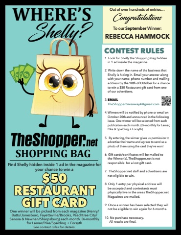 WHERE%u2019SShelly?SHOPPING BAGFind Shelly hidden inside 1 ad in the magazine for your chance to win a$50 RESTAURANT GIFT CARDCONTEST RULES1. Look for Shelly the Shopping Bag hidden in 1 ad inside the magazine. 2. Write down the name of the business that Shelly is hiding in. Email your answer along with your name, phone number and mailing address by the 18th of October for a chance to win a $50 Restaurant gift card from one of our advertisers.3. EMAILTheShopperGiveaway4@gmail.com 4. Winners will be notified by phone or email on October 20th and announced in the following issue. One winner will be selected from each publication each month. (Bi-monthly for Lamar, Pike & Spalding + Forsyth).5. By entering, the winner gives us permission to advertise their name and agrees to send us a photo of them using the card they%u2019ve won!6. Gift cards/certificates will be mailed to the Winner(s). TheShopper.net is not responsible for a lost gift card. 7. TheShopper.net staff and advertisers are not eligible to win.8. Only 1 entry per physical address will be accepted and contestants must physically live in the areas TheShopper.net Magazines are mailed.9. Once a winner has been selected they will not be eligible to win again for 6 months.10. No purchase necessary. All results are final.CongratulationsTo our September Winner:REBECCA HAMMOCKOut of over hundreds of entries%u2026One winner will be picked from each magazine (Henry/Butts/Jonesboro, Fayetteville/Brooks, Peachtree City/Senoia & Newnan/Sharpsburg) each month. Bi-monthly for Lamar/Pike/Spalding + Forsyth See contest rules for details.
