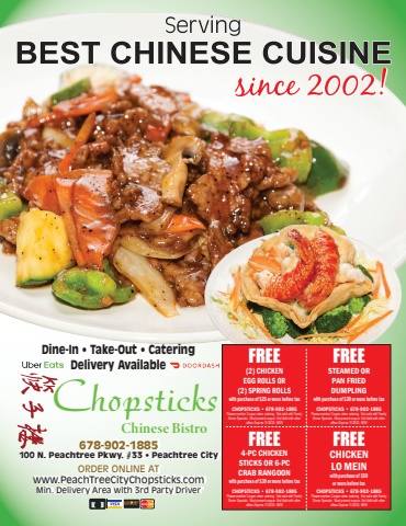 Dine-In %u2022 Take-Out %u2022 CateringDelivery AvailablePlease mention Coupon when ordering. Not valid with Family Dinner Specials. Must present coupon. Not Valid with other offers. Expires 11/30/25. NEWCHOPSTICKS %u2022 678-902-1885FREE(2) CHICKENEGG ROLLS OR(2) SPRING ROLLSwith purchase of $25 or more before taxPlease mention Coupon when ordering. Not valid with Family Dinner Specials. Must present coupon. Not Valid with other offers. Expires 11/30/25. NEWCHOPSTICKS %u2022 678-902-1885FREESTEAMED ORPAN FRIED DUMPLINGwith purchase of $30 or more before taxPlease mention Coupon when ordering. Not valid with Family Dinner Specials. Must present coupon. Not Valid with other offers. Expires 11/30/25. NEWCHOPSTICKS %u2022 678-902-1885FREE4-PC CHICKENSTICKS OR 6-PCCRAB RANGOONwith purchase of $30 or more before taxPlease mention Coupon when ordering. Not valid with Family Dinner Specials. Must present coupon. Not Valid with other offers. Expires 11/30/25. NEWCHOPSTICKS %u2022 678-902-1885FREECHICKENLO MEINwith purchase of $50or more before taxChopsticksfifffflffifl%u001afl%u0019%u0018ffl%u001a%u0017%u0016%u0015678-902-1885100 N. Peachtree Pkwy. #33 %u2022 Peachtree CityORDER ONLINE ATwww.PeachTreeCityChopsticks.comMin. Delivery Area with 3rd Party Driver678-902-1885100 N. Peachtree Pkwy. #33 %u2022 Peachtree CityORDER ONLINE ATwww.PeachTreeCityChopsticks.comMin. Delivery Area with 3rd Party Driver