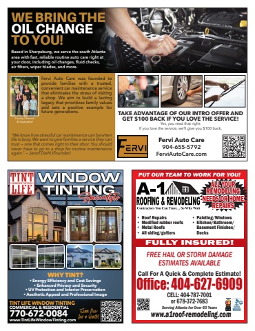 Fervi Auto Care was founded to provide families with a trusted, convenient car maintenance service that eliminates the stress of visiting a shop. We aim to build a lasting legacy that prioritizes family values and sets a positive example for future generations.%u201cWe know how stressful car maintenance can be when life is busy. We want to give families a service they can trust %u2014 one that comes right to their door. You should never have to go to a shop for routine maintenance again.%u201d %u2014 Jarod Diehl (Founder)Based in Sharpsburg, we serve the south Atlanta area with fast, reliable routine auto care right at your door, including oil changes, fluid checks, air filters, wiper blades, and more.Family Owned & OperatedFervi Auto Care904-655-5792FerviAutoCare.comTAKE ADVANTAGE OF OUR INTRO OFFER AND GET $100 BACK IF YOU LOVE THE SERVICE!Yes, you read that right. If you love the service, we%u2019ll give you $100 back.TINT LIFE WINDOW TINTINGCOMMERCIAL & RESIDENTIAL770-672-0084www.TintLifeWindowTinting.comScan Now for a Quote!WHY TINT? %uf0a7 Energy Efficiency and Cost Savings%uf0a7 Enhanced Privacy and Security%uf0a7 UV Protection and Interior Preservation%uf0a7 Aesthetic Appeal and Professional ImageCall For A Quick & Complete Estimate!CELL: 404-787-7001or 678-372-7683PUT OUR TEAM TO WORK FOR YOU!ALL YOUR REMODELINGNEEDS OR HOME REPAIRSServing Atlanta for Over 60 Years www.a1roof-remodeling.comFREE HAIL OR STORM DAMAGEESTIMATES AVAILABLEOffice: 404-627-6909FULLY INSURED!%u2022 Roof Repairs%u2022 Modified rubber roofs%u2022 Metal Roofs%u2022 All siding/gutters%u2022 Painting/Windows%u2022 Kitchen/Bathroom/Basement Finishes/Decks
