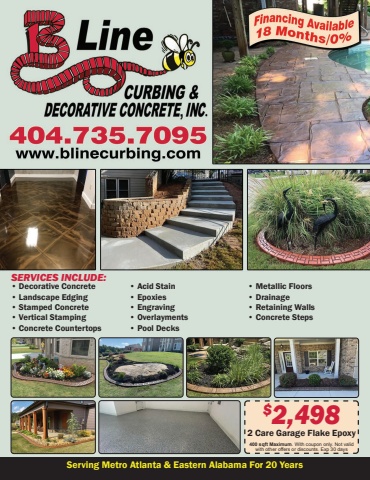 %u2022 Decorative Concrete%u2022 Landscape Edging%u2022 Stamped Concrete%u2022 Vertical Stamping%u2022 Concrete Countertops%u2022 Acid Stain%u2022 Epoxies%u2022 Engraving%u2022 Overlayments%u2022 Pool Decks%u2022 Metallic Floors%u2022 Drainage%u2022 Retaining Walls%u2022 Concrete StepsServing Metro Atlanta & Eastern Alabama For 20 YearsSERVICES INCLUDE:$2,4982 Care Garage Flake Epoxy400 sqft Maximum. With coupon only. Not valid with other offers or discounts. Exp 30 days