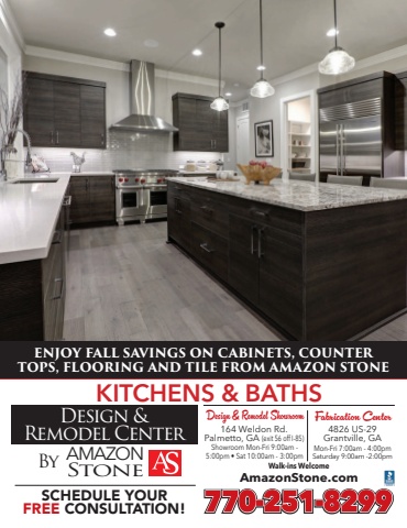 AmazonStone.com770-251-8299 SCHEDULE YOUR FREE CONSULTATION!Showroom Mon-Fri 9:00am - 5:00pm %u2022 Sat 10:00am - 3:00pm164 Weldon Rd. Palmetto, GA (exit 56 off I-85)4826 US-29 Grantville, GAMon-Fri 7:00am - 4:00pmSaturday 9:00am -2:00pmFabrication CenterKITCHENS & BATHSDesign & Remodel ShowroomBy AMAZONStoneDesign &Remodel CenterWalk-ins Welcome ENJOY FALL SAVINGS ON CABINETS, COUNTER TOPS, FLOORING AND TILE FROM AMAZON STONE