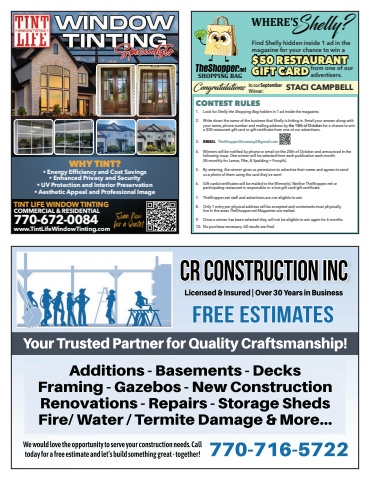 CR CONSTRUCTION incFREE ESTIMATESLicensed & Insured | Over 30 Years in BusinessAdditions - Basements - DecksFraming - Gazebos - New ConstructionRenovations - Repairs - Storage ShedsFire/ Water / Termite Damage & More...Your Trusted Partner for Quality Craftsmanship!We would love the opportunity to serve your construction needs. Call today for a free estimate and let%u2019s build something great - together! 770-716-5722TINT LIFE WINDOW TINTINGCOMMERCIAL & RESIDENTIAL770-672-0084www.TintLifeWindowTinting.comScan Now for a Quote!WHY TINT? %uf0a7 Energy Efficiency and Cost Savings%uf0a7 Enhanced Privacy and Security%uf0a7 UV Protection and Interior Preservation%uf0a7 Aesthetic Appeal and Professional Image1. Look for Shelly the Shopping Bag hidden in 1 ad inside the magazine. 2. Write down the name of the business that Shelly is hiding in. Email your answer along with your name, phone number and mailing address by the 18th of October for a chance to win a $50 restaurant gift card or gift certificate from one of our advertisers.3. EMAIL TheShopperGiveaway2@gmail.com 4. Winners will be notified by phone or email on the 20th of October and announced in the following issue. One winner will be selected from each publication each month. (Bi-monthly for Lamar, Pike, & Spalding + Forsyth).5. By entering, the winner gives us permission to advertise their name and agrees to send us a photo of them using the card they%u2019ve won!6. Gift cards/certificates will be mailed to the Winner(s). Neither TheShopper.net or participating restaurant is responsible or a lost gift card/gift certificate. 7. TheShopper.net staff and advertisers are not eligible to win.8. Only 1 entry per physical address will be accepted and contestants must physically live in the areas TheShopper.net Magazines are mailed.9. Once a winner has been selected they will not be eligible to win again for 6 months.10. No purchase necessary. All results are final.CONTEST RULESWHERE%u2019SShelly?SHOPPING BAGFind Shelly hidden inside 1 ad in the magazine for your chance to win a$50 RESTAURANT GIFT CARDCongratulations to our SeptemberWinner: STACI CAMPBELLfrom one of our advertisers.