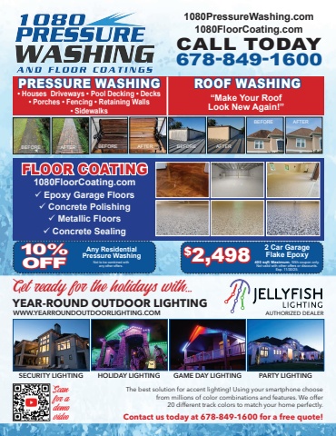 FLOOR COATING1080FloorCoating.com%uf0fc Epoxy Garage Floors%uf0fc Concrete Polishing%uf0fc Metallic Floors%uf0fc Concrete Sealing1080PressureWashing.com1080FloorCoating.comCALL TODAY678-849-1600BEFORE AFTER BEFORE AFTERBEFORE AFTERBEFORE AFTERNot to be combined with any other offers.Any Residential 10% Pressure Washing OFFPRESSURE WASHING%u2022 Houses Driveways %u2022 Pool Decking %u2022 Decks %u2022 Porches %u2022 Fencing %u2022 Retaining Walls %u2022 SidewalksROOF WASHING%u201cMake Your RoofLook New Again!%u201d$2,498 2 Car Garage Flake Epoxy400 sqft Maximum. With coupon only. Not valid with other offers or discounts. Exp. 11/30/25.AUTHORIZED DEALERSECURITY LIGHTING HOLIDAY LIGHTING GAME DAY LIGHTING PARTY LIGHTINGGet ready for the holidays with%u2026YEAR-ROUND OUTDOOR LIGHTINGScan for a demo videoWWW.YEARROUNDOUTDOORLIGHTING.COMThe best solution for accent lighting! Using your smartphone choose from millions of color combinations and features. We offer 20 different track colors to match your home perfectly. Contact us today at 678-849-1600 for a free quote!