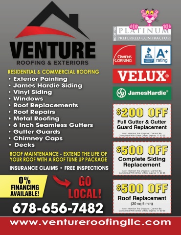 %u2022 Exterior Painting%u2022 James Hardie Siding%u2022 Vinyl Siding%u2022 Windows%u2022 Roof Replacements%u2022 Roof Repairs%u2022 Metal Roofing%u2022 6 Inch Seamless Gutters%u2022 Gutter Guards%u2022 Chimney Caps%u2022 DecksINSURANCE CLAIMS %u2022 FREE INSPECTIONSGO LOCAL!678-656-7482www.ventureroofingllc.comROOF MAINTENANCE - EXTEND THE LIFE OF YOUR ROOF WITH A ROOF TUNE UP PACKAGERESIDENTIAL & COMMERCIAL ROOFINGFull Gutter & Gutter Guard ReplacementMust Mention The Shopper. Cannot Be Combined With Other Offers. Expires: 11-30-25Must Mention The Shopper. Cannot Be Combined With Other Offers. Expires: 11-30-25Must Mention The Shopper. Cannot Be Combined With Other Offers. Expires: 11-30-25Complete Siding ReplacementRoof Replacement(30 sq ft min)0%FINANCINGAVAILABLE!