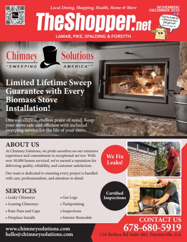 Local Dining, Shopping, Health, Home & More LAMAR, PIKE, SPALDING & FORSYTHNOVEMBER/DECEMBER 2025Find me inside for a chance to win a $50 gift card!Rules on page 16ABOUT USSERVICESCONTACT USAt Chimney Solutions, we pride ourselves on our extensive experience and commitment to exceptional service. With over 50,000 homes serviced, we%u2019ve earned a reputation for delivering quality, reliability, and customer satisfaction. Our team is dedicated to ensuring every project is handled with care, professionalism, and attention to detail.%u2022 Leaky Chimneys%u2022 Leaning Chimneys%u2022 Rain Pans and Caps%u2022 Fireplace Installs%u2022 Gas Logs%u2022 Tuckpointing%u2022 Inspections%u2022 Interior Remodelswww.chimneysolutions.comhello@chimneysolutions.com 116 Bethea Rd Suite 402, Fayetteville, GA678-680-5919Certified InspectionsWe Fix Leaks!Limited Lifetime Sweep Guarantee with EveryBiomass Stove Installation!One installation, endless peace of mind. Keep your stove safe and efficient with included sweeping service for the life of your stove.