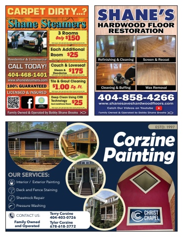 ESTD: 1997OUR SERVICES:CONTACT US: Terry Corzine404-403-0726Tyler Corzine678-618-3772Family Ownedand OperatedInterior / Exterior PaintingDeck and Fence StainingSheetrock RepairPressure Washing3 Rooms Couch & LoveseatDeep Clean Using CRB TechnologyEach Additional RoomTile & Grout CleaningSteam & DeodorizeEach AdditionalRoom$150$175$1.00$25$25OnlySq. Ft.With coupon. Not valid with other offers. Expires 12-31-25. TSNWith coupon. Not valid with other offers. Expires 12-31-25. TSNWith coupon. Not valid with other offers. Expires 12-31-25. TSNWith coupon. Not valid with other offers. Expires 12-31-25. TSNWith coupon. Not valid with other offers. Expires 12-31-25. TSNSHANE%u2019SCatch Our Videos on YoutubeHARDWOOD FLOORRESTORATION404-858-4266www.shanesaveshardwoodfloors.comRefinishing & CleaningCleaning & Buffing Wax RemovalScreen & RecoatFamily Owned & Operated by Bobby Shane Brooks