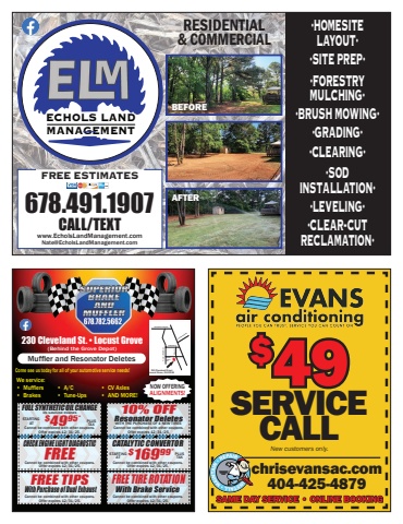 ECHOLS LANDMANAGEMENTFREE ESTIMATES678.491.1907CALL/TEXTwww.EcholsLandManagement.comNate@EcholsLandManagement.comCARDRESIDENTIAL& COMMERCIAL%u2022HOMESITE LAYOUT%u2022%u2022SITE PREP%u2022%u2022FORESTRY MULCHING%u2022%u2022BRUSH MOWING%u2022%u2022GRADING%u2022%u2022CLEARING%u2022%u2022SOD INSTALLATION%u2022%u2022LEVELING%u2022%u2022CLEAR-CUTRECLAMATION%u2022BEFOREAFTERchrisevansac.com404-425-4879SAME DAY SERVICE %u2022 ONLINE BOOKINGNew customers only.$49SERVICECALL230 Cleveland St. %u2022 Locust Grove(Behind the Grove Depot)Bill Gardner ParkwayPeeksville Road Smith StreetFrancis Ward Drive230 Cleveland StreetLocust Grove, GA 30248 Ridge St.IndianCreek Rd.Come see us today for all of your automotive service needs!CATALYTIC CONVERTORCannot be combined with other coupons.Offer expires 12/31/25.Cannot be combined with other coupons.Offer expires 12/31/25.With Brake ServiceCHECK ENGINE LIGHT DIAGNOSTICCannot be combined with other coupons.Offer expires 12/31/25.Cannot be combined with other coupons.Offer expires 12/31/25.FREE TIPSFREE $169 STARTING 99* ATPLUSTAXMuffler and Resonator DeletesWe service:%u2022 Mufflers%u2022 Brakes%u2022 A/C%u2022 Tune-Ups%u2022 CV Axles%u2022 AND MORE!Cannot be combined with other coupons.Offer expires 12/31/25.FULL SYNTHETIC OIL CHANGE$49 STARTING 95* AT PLUSTAXNOW OFFERING ALIGNMENTS!Resonator Deletes With Purchase of Dual Exhaust10% OFFWITH THE PURCHASE OF 4 NEW TIRESCannot be combined with other coupons.Offer expires 12/31/25.ON GASOLINE ENGINESFREE TIRE ROTATION