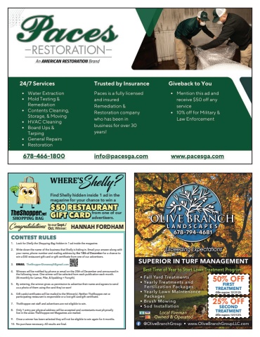 1. Look for Shelly the Shopping Bag hidden in 1 ad inside the magazine. 2. Write down the name of the business that Shelly is hiding in. Email your answer along with your name, phone number and mailing address by the 18th of December for a chance to win a $50 restaurant gift card or gift certificate from one of our advertisers.3. EMAIL TheShopperGiveaway5@gmail.com 4. Winners will be notified by phone or email on the 20th of December and announced in the following issue. One winner will be selected from each publication each month. (Bi-monthly for Lamar, Pike, & Spalding + Forsyth).5. By entering, the winner gives us permission to advertise their name and agrees to send us a photo of them using the card they%u2019ve won!6. Gift cards/certificates will be mailed to the Winner(s). Neither TheShopper.net or participating restaurant is responsible or a lost gift card/gift certificate. 7. TheShopper.net staff and advertisers are not eligible to win.8. Only 1 entry per physical address will be accepted and contestants must physically live in the areas TheShopper.net Magazines are mailed.9. Once a winner has been selected they will not be eligible to win again for 6 months.10. No purchase necessary. All results are final.CONTEST RULESWHERE%u2019SShelly?SHOPPING BAGFind Shelly hidden inside 1 ad in the magazine for your chance to win a$50 RESTAURANT GIFT CARDCongratulations to our Sept./Oct. Winner: HANNAH FORDHAMfrom one of our advertisers.50% OFFFIRST TREATMENTOffer expires 12/31/25.25% OFFSECOND TREATMENTOffer expires 12/31/25.