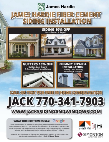 FREEESTIMATES! WHAT OUR CUSTOMERS SAY:%u201cJack took the time to make sure everything was completed to expectation and went above and beyond... The best recommendation Jack can get is that another home right down the street from me is being sided now. The owner was impressed with our work and decided to give his home a face lift too.%u201d - Rob L%u201cJack was recommended by friends and we are very grateful as this project was performed exceptionally well...%u201d - Katie W, Local GuideJAMES HARDIE FIBER CEMENT SIDING INSTALLATION JACK%u2019SSIDING & WINDOWS12-24 MONTHNO INTEREST LOANSOR PAYMENTS AS LOW AS$129/mo.FINANCING AVAILABLEWWW.JACKSSIDINGANDWINDOWS.COMJACK 770-341-7903CALL OR TEXT FOR FREE IN HOME CONSULTATIONSTARTING AT$379.00DOUBLE HUNG INSTALLEDSome restrictions apply. Call for details. Cannot be combined with other offers or discounts.25YEARSServicingFayette, Coweta& Henry CountySIDING 10% OFFInstallation & RepairGUTTERS 10% OFFGutter, Leaf Guard & Down Spout InstallationCHIMNEY REPAIR & INSTALLATIONChimney Caps, Residing, Reflashing & SkylightsWINDOWS10% OFFInstallationAvailable in Black, Bronze, Brown, and Many Other ColorsFusion-welded Frame and SashAir LockTMLap-Lok%u00ae Meeting RailSingle Cam LockFlush-mount Tilt LatchesTilt-in/lift-out Sash3/4%u201d Insulating Glass UnitContoured Extruded Lift RailsStainless Steel Constant Force3/4%u201d Coil Spring Balance SystemSloped Sill
