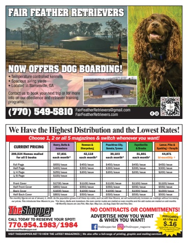 %u2022 Temperature controlled kennels%u2022 Spacious airing yards%u2022 Located in Barnesville, GAContact us to book your next trip or for more info on our obedience and retriever training programs.FAIR FEATHER RETRIEVERS(770) 549-5810NOW OFFERS DOG BOARDING!FairFeatherRetrievers@gmail.comFairFeatherRetrievers.comWe Have the Highest Distribution and the Lowest Rates!Choose 1, 2 or all 5 magazines & switch whenever you want!Services@TheShopper.netThe monthly figures are as of January 1, 2025. As the population grows in all these zip codes, such as with New Movers, we will automatically increase our mailings without increasing our prices. This introduces New Movers to you. *For Henry, Butts and Jonesboro: the even carrier routes are mailed on even months and the odd routes are mailed on odd months. +Bi-Monthly issues are Jan/Feb, Mar/Apr, May/Jun, Jul/Aug, Sept/Oct and Nov/Dec.VISIT THESHOPPER.NET TO VIEW THE LATEST MAGAZINES | We also offer a full-range of printing, graphic and mailing services.CALL TODAY TO RESERVE YOUR SPOT!770.954.1983/1984ADVERTISE HOW YOU WANT & WHEN YOU WANT! $.16POSTCARDS AS LOW ASIncludes Design, Printing & Postage. Runs with magazine distribution. No minimums.TheShopper.Net @TheShopper_magazineNO CONTRACTS OR COMMITMENTS! Henry, Butts & Newnan & Peachtree City, Fayetteville Lamar, Pike & CURRENT PRICING Jonesboro Sharpsburg Senoia, Tyrone & Brooks Spalding + Forsyth 206,524 Homes mailed 57,831 42,118 30,103 31,601 44,871 for all 5 books each month* each month* each month* each month* bi-monthly +Full Page $650/issue $450/issue $450/issue $450/issue $450/issue Half Page $400/issue $300/issue $300/issue $300/issue $300/issue 1/4 Page $250/issue $200/issue $200/issue $200/issue $200/issue 1/8 Page $150/issue Front Cover $1700/issue $1100/issue $1100/issue $1100/issue $1100/issue Half Front Cover $850/issue $550/issue $550/issue $550/issue $550/issue Back Cover $1600/issue $1000/issue $1000/issue $1000/issue $1000/issue Half Back Cover $800/issue $500/issue $500/issue $500/issue $500/issue