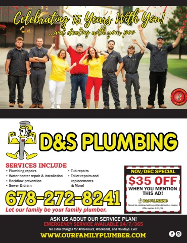 678-272-8241Let our family be your family plumber.Cannot be combined with any other discount or coupon.Offer expires 1/31/26.$35 OFFWHEN YOU MENTIONTHIS AD!NOV/DEC SPECIALSERVICES INCLUDE%u2022 Plumbing repairs%u2022 Water heater repair & installation%u2022 Backflow prevention%u2022 Sewer & drain%u2022 Tub repairs%u2022 Toilet repairs and replacements & More!WWW.OURFAMILYPLUMBER.COMASK US ABOUT OUR SERVICE PLAN!EMERGENCY SERVICE AVAILABLE 24/7/365No Extra Charges for After-Hours, Weekends, and Holidays. Ever.