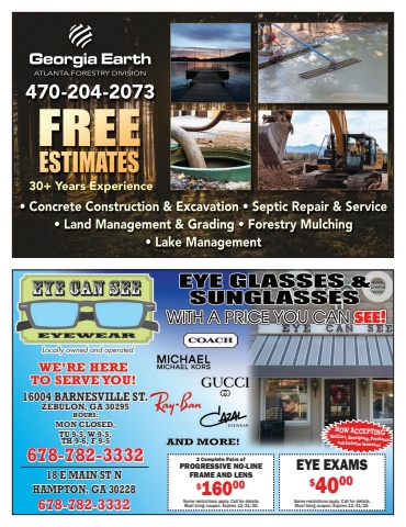 NOW ACCEPTING WellCare, Amerigroup, Peachstate and Ambetter Insurance!18 E MAIN ST NHAMPTON, GA 30228678-782-333216004 BARNESVILLE ST.ZEBULON, GA 30295HOURS:MON CLOSED,TU 9-5, W 9-5,TH 9-6, F 9-5678-782-333216004 BARNESVILLE ST.ZEBULON, GA 30295HOURS:MON CLOSED,TU 9-5, W 9-5,TH 9-6, F 9-5678-782-3332Some restrictions apply. Call for details. Must bring coupon. Expires 12/31/25.$4000EYE EXAMS 2 Complete Pairs ofPROGRESSIVE NO-LINEFRAME AND LENS$16000Some restrictions apply. Call for details. Must bring coupon. Expires 12/31/25.%u2022 Concrete Construction & Excavation %u2022 Septic Repair & Service %u2022 Land Management & Grading %u2022 Forestry Mulching %u2022 Lake ManagementFREEESTIMATES 470-204-207330+ Years ExperienceGeorgia EarthATLANTA FORESTRY DIVISION