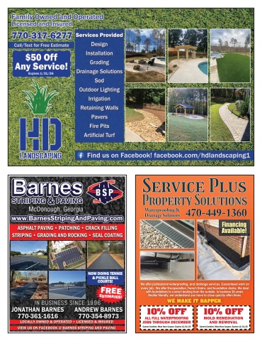 Expires 1/31/26NOW DOING TENNIS & PICKLE BALLCOURTS!FREEESTIMATES!10% OFFALL FULL WATERPROOFINGJOBS THROUGH DECEMBER10% OFFMOLD REMEDIATION AND REMOVAL Cannot Combine. Must Have Coupon. Expires 12/31/25 Cannot Combine. Must Have Coupon. Expires 12/31/25470-449-1360 Waterproofing &Drainage SolutionsFinancing Available!WE MAKE IT HAPPEN.We offer professional waterproofing, and drainage services. Guaranteed work onevery job. We offer Encapsulation, French Drains, and foundation drains. We deal with foundations to correct leaking from the outside. In business 20 years. Realtor friendly, we understand you have to close quickly often times.Service PlusProperty Solutions