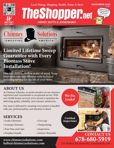 Local Dining, Shopping, Health, Home & More HENRY, BUTTS & JONESBORONOVEMBER 2025Find me inside for a chance to win a $50 gift card!Rules on page 72ABOUT USSERVICESCONTACT USAt Chimney Solutions, we pride ourselves on our extensive experience and commitment to exceptional service. With over 50,000 homes serviced, we%u2019ve earned a reputation for delivering quality, reliability, and customer satisfaction. Our team is dedicated to ensuring every project is handled with care, professionalism, and attention to detail.%u2022 Leaky Chimneys%u2022 Leaning Chimneys%u2022 Rain Pans and Caps%u2022 Fireplace Installs%u2022 Gas Logs%u2022 Tuckpointing%u2022 Inspections%u2022 Interior Remodelswww.chimneysolutions.comhello@chimneysolutions.com 116 Bethea Rd Suite 402, Fayetteville, GA678-680-5919Certified InspectionsWe Fix Leaks!Limited Lifetime Sweep Guarantee with EveryBiomass Stove Installation!One installation, endless peace of mind. Keep your stove safe and efficient with included sweeping service for the life of your stove.