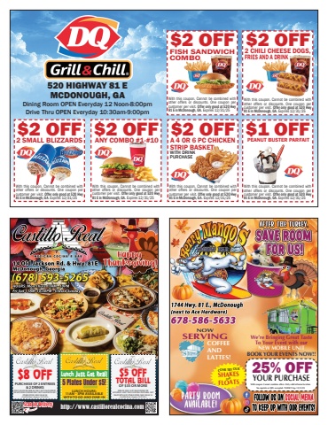 Dining Room OPEN Everyday 12 Noon-8:00pmDrive Thru OPEN Everyday 10:30am-9:00pmWith this coupon. Cannot be combined with other offers or discounts. One coupon per customer per visit. Offer only good at 520 Hwy 81 E in McDonough, GA. Expires 12/31/25$2 OFF2 SMALL BLIZZARDSWith this coupon. Cannot be combined with other offers or discounts. One coupon per customer per visit. Offer only good at 520 Hwy 81 E in McDonough, GA. Expires 12/31/25$2 OFFANY COMBO #1-#10With this coupon. Cannot be combined with other offers or discounts. One coupon per customer per visit. Offer only good at 520 Hwy 81 E in McDonough, GA. Expires 12/31/25$2 OFFA 4 OR 6 PC CHICKEN STRIP BASKETWITH DRINK PURCHASEWith this coupon. Cannot be combined with other offers or discounts. One coupon per customer per visit. Offer only good at 520 Hwy 81 E in McDonough, GA. Expires 12/31/25$2 OFFFISH SANDWICH COMBO520 HIGHWAY 81 EMCDONOUGH, GA With this coupon. Cannot be combined with other offers or discounts. One coupon per customer per visit. Offer only good at 520 Hwy 81 E in McDonough, GA. Expires 12/31/25$2 OFF2 CHILI CHEESE DOGS, FRIES AND A DRINKWith this coupon. Cannot be combined with other offers or discounts. One coupon per customer per visit. Offer only good at 520 Hwy 81 E in McDonough, GA. Expires 12/31/25$1 OFFPEANUT BUSTER PARFAITScan for Delivery http://www.castillorealcocina.comONLY VALID FOR DINE-IN ONLY. NOT VALID FRIDAY OR SATURDAY. DINNER ONLY. NOT VALID WITH ANY OTHER OFFER. MAX VALUE $8%u2022 Castillo Real %u2022 Expires 12/31/25 %u2022$8 OFFPURCHASE OF 2 ENTREES & 2 DRINKS$5 OFFTOTAL BILLOF $35 OR MOREDINE-IN ONLY. NOT VALID FRIDAY ORSATURDAY. LIMIT TWO COUPONS PER TABLE. NOT VALID WITH ANY OTHER OFFER. MAX VALUE $5%u2022 Castillo Real %u2022 Expires 12/31/25 %u2022LUNCH HOURS: 11AM - 3PM AVAILABLE WITH TO GO AND DINE-INLunch Just Got Real!5 Plates Under $5!25% OFFYOUR PURCHASEWith coupon. Cannot combine offers. Only valid at home location.No reprints or QR%u2019s accepted. TSHNET Exp. 12/31/25We%u2019re Bringing Great Taste To Your Event with ourNEW MOBILE UNIT BOOK YOUR EVENTS NOW!!NOWSERVINGCOFFEE AND LATTES!COME TRY OURSHAKESFLOATS AND