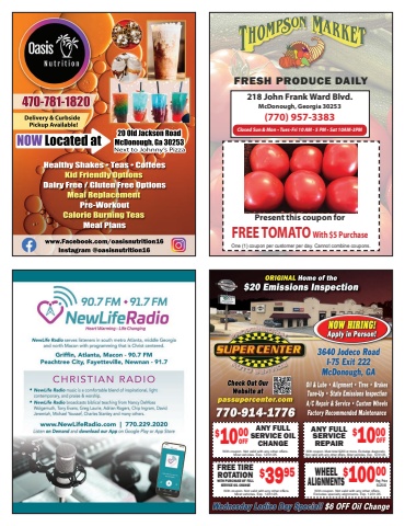 NOW Located atNext to Johnny%u2019s PizzaHealthy Shakes %u2022 Teas %u2022 CoffeesDairy Free / Gluten Free OptionsPre-WorkoutMeal PlansKid Friendly OptionsMeal ReplacementCalorie Burning TeasDelivery & Curbside Pickup Available!20 Old Jackson RoadMcDonough, Ga 30253470-781-1820One (1) coupon per customer per day. Cannot combine coupons.Present this coupon forFREE TOMATO With $5 PurchaseClosed Sun & Mon %u2022 Tues-Fri 10 AM - 5 PM %u2022 Sat 10AM-3PM218 John Frank Ward Blvd.McDonough, Georgia 30253(770) 957-3383FRESH PRODUCE DAILYWith coupon. Not valid with any other offers.Most vehicles. Exp. 12/31/25.$3995With coupon. Not valid with any other offers.Most vehicles. Exp. 12/31/25.ANY FULLSERVICE OIL CHANGE$1000OFFWith coupon. Not valid with any other offers.Excludes specialty alignments. Exp. 12/31/25.$100 WHEEL 00ALIGNMENTS Reg. Price$125.00$1000 ANY FULLSERVICEREPAIRFREE TIREROTATIONWITH PURCHASE OF FULL SERVICE OIL CHANGEOFFWith coupon. Must total $200 or more. Excludes diagnostic. Not valid with any other offers. Most vehicles. Exp. 12/31/25.