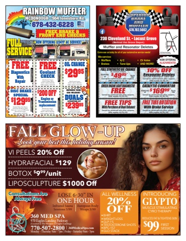 970 Eagles Landing Parkway(Located in The Shoppes at Eagles Landing) 770-507-2800 | 360MedicalSpa.comMonday - Thursday 9am - 7pm | Friday - Saturday 9am - 3pm360 MED SPAVI PEELS 20% OffHYDRAFACIAL $129BOTOX $999/unit LIPOSCULPTURE $1000 OffALL WELLNESS20%OFF%u2022 BHRT%u2022 WEIGHT LOSS%u2022 GLP-1%u2019S%u2022 TESTOSTERONE SHOTS%u2022 BPC-157%u2022 GLO STACKConsultations Are Always FreeInfrared Sauna Sessions 5/99LOSE 6-30%u201d INONE HOUREuropean Body Wraps 3/99GLYPTOINTRODUCINGMUSCLE STIMULATING CYRO THERAPYREDUCES FAT & TIGHTENS SKIN$99 FIRST SESSIONNOW OFFERING 1234YF AC SERVICE!OIL CHANGE$2995 TheShopper.netTheShopper.netDISC BRAKESPECIALStandard Pads, Turn Rotors,Anti-Seize All Moving Parts. Most cars. 1 year or 12,000 miles.Must Present Coupon.Offer expires 12/31/25.$12995 TheShopper.net$200 OFFEngine or Transmission replacement Must Present Coupon.Cannot Combine offers.MOST CARS & TRUCKS.Offer expires 12/31/25.FREECoolantCHECKMust Present Coupon.Cannot Combine Offers.MOST CARS & TRUCKS.Offer expires 12/31/25.TheShopper.net TheShopper.net TheShopper.netIMPROVE YOURGAS MILEAGE!$23995DUALSSTARTING ATFREEDiagnostics With RepairFULLSERVICEMust Present Coupon.MOST CARS & TRUCKS.Offer expires 12/31/25.TRUCKS & SUVSMust Present Coupon.Offer expires 12/31/25.230 Cleveland St. %u2022 Locust Grove(Behind the Grove Depot)Bill Gardner ParkwayPeeksville Road Smith StreetFrancis Ward Drive230 Cleveland StreetLocust Grove, GA 30248 Ridge St.IndianCreek Rd.Come see us today for all of your automotive service needs!CATALYTIC CONVERTORCannot be combined with other coupons.Offer expires 12/31/25.Cannot be combined with other coupons.Offer expires 12/31/25.With Brake ServiceCHECK ENGINE LIGHT DIAGNOSTICCannot be combined with other coupons.Offer expires 12/31/25.Cannot be combined with other coupons.Offer expires 12/31/25.FREE TIPSFREE $169 STARTING 99* ATPLUSTAXMuffler and Resonator DeletesWe service:%u2022 Mufflers%u2022 Brakes%u2022 A/C%u2022 Tune-Ups%u2022 CV Axles%u2022 AND MORE!Cannot be combined with other coupons.Offer expires 12/31/25.FULL SYNTHETIC OIL CHANGE$49 STARTING 95* AT PLUSTAXNOW OFFERING ALIGNMENTS!Resonator Deletes With Purchase of Dual Exhaust10% OFFWITH THE PURCHASE OF 4 NEW TIRESCannot be combined with other coupons.Offer expires 12/31/25.ON GASOLINE ENGINESFREE TIRE ROTATION