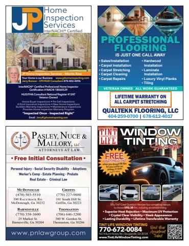 GGGGGGG(770) 227-9880101 South Hill St.Griffin, Ga 30223BBBBBBBBBBB(770) 358-360025 Market St.Barnesville, Ga 30204TTTTTTTTT(706) 646-3200300 W. Gordon St.Thomaston, Ga 30286MMDDDDDDD(470) 503-5510390 RRRRRRRRR RR.McDonough, Ga 30252TINT LIFE WINDOW TINTING770-672-0084963 N Burnt Hickory Rd. | Douglasville, GA 30134www.TintLifeWindowTinting.comBook YourAppointment Today!Why Tint? Great Question! Here are four compelling reasons to choose XPEL XR film, including windshield tinting:%uf0a7 Superior Heat Rejection %uf0a7 Maximum UV Protection%uf0a7 Crystal Clear Visibility %uf0a7 Sleek Appearance%uf0a7 Lasting Durability %uf0a7 Lifetime Transferable WarrantyFREEWINDSHIELD TINTwhen you choose XR film for your entire car, pickup, or SUV!Expires 11/30/25HomeInspectionServicesInterNACHI%u00ae CertifiedJP Home Inspection Services %u2013 Atlanta AreaYour Home is our Business www.jphomeinspecting.comJerry Bonner %u2013 CPI/HUD Consultant 470-402-4096InterNACHI%u00ae Certified Professional Home InspectorCertification # NACHI 18060529HUD/FHA Consultant National Register #1247Veteran OwnedHome Buyer Inspections %u2022 Pre-Sell Inspections4-Point Insurance Inspections %u2022 New Home InspectionsBuilders Warranty Inspections %u2022 Maintenance InspectionsProvides Home Inspection Warranty ProgramEmail: Jerry@ jphomeinspecting.com%u201cInspected Once %u2013 Inspected Right%u201d QUALTEKK FLOORING, LLC404-259-0700 | 678-612-4017VETERAN OWNED %u2022 ALL WORK GUARANTEEDLIFETIME WARRANTY ON ALL CARPET STRETCHING%u2022 Sales/Installation%u2022 Carpet Installation%u2022 Carpet Stretching%u2022 Carpet Cleaning%u2022 Carpet Repairs%u2022 Hardwood Installation%u2022 Laminate Installation%u2022 Luxury Vinyl Planks%u2022 TilingPROFESSIONAL FLOORINGIS JUST ONE CALL AWAY