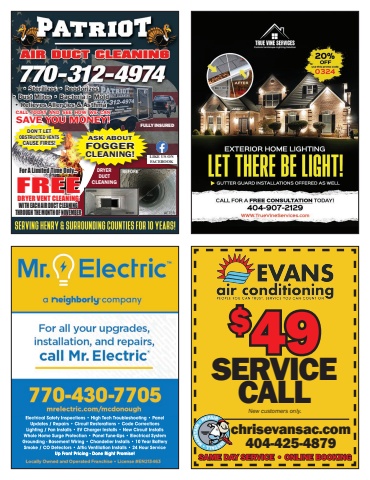 DON%u2019T LETOBSTRUCTED VENTSCAUSE FIRES!BEFOREAFTERASK ABOUTFOGGERCLEANING!DRYER DUCTCLEANINGFor A Limited Time Only...%u2022 Sterilizes %u2022 Deodorizes%u2022 Dust Mites %u2022 Bacteria %u2022 Mold%u2022 Relieves Allergies & AsthmaCALL TODAY AND SEE HOW WE CANSAVE YOU MONEY!FREEDRYER VENT CLEANINGWITH EACH AIR DUCT CLEANING THROUGH THE MONTH OF NOVEMBERFULLY INSUREDLIKE US ON FACEBOOKElectrical Safety Inspections %u2022 High Tech Troubleshooting %u2022 PanelUpdates / Repairs %u2022 Circuit Restorations %u2022 Code CorrectionsLighting / Fan Installs %u2022 EV Charger Installs %u2022 New Circuit InstallsWhole Home Surge Protection %u2022 Panel Tune-Ups %u2022 Electrical SystemGrounding - Basement Wiring %u2022 Chandelier Installs %u2022 10 Year BatterySmoke / CO Detectors %u2022 Attic Ventilation Installs %u2022 24 Hour Service Up Front Pricing - Done Right Promise!chrisevansac.com404-425-4879SAME DAY SERVICE %u2022 ONLINE BOOKINGNew customers only.$49SERVICECALL