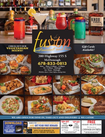 380 Highway 155 SMcDonough678-833-0813Mon. - Thurs 11:00am - 11:00pmFri. 11:00am - MidnightSat. Noon - MidnightKitchen closes 1 hour before closing time.DOWNLOADOUR APPTODAY FOREASY ONLINEORDERINGSEARCH FOR FUSION MCDONOUGH RESTAURANTAND GET YOUR FIRST REWARD!PLACE YOUR ORDER TODAY AND GET IT DELIVEREDAPPLY YOUR REWARDS ONPICK UP ORDERS OR DINE-IN$1000 OFFTWODINNERENTR%u00c9ES$500 OFFTWOLUNCHENTR%u00c9ESCannot be combined with other offers.Dine-In Only. Expires 12/31/25.and 2 Beveragesorand 2 BeveragesFREEDESSERT OR APPETIZERWith the purchase of2 DINNER ENTR%u00c9ES(Max Value $8) Cannot be combined with otheroffers. Dine-In Only. Expires 12/31/25.WE ARE OPEN FOR DINE-IN, TAKE-OUT AND DELIVERY! || WE CATER!CHECK OUT OURVEGETARIAN MENU!Gift CardsAvailable!