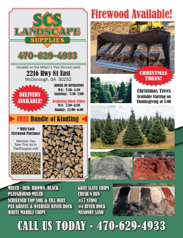 (located on the Milam%u2019s Tree Service yard)2216 Hwy 81 EastMcDonough, GA 30252FREE Bundle of Kindling * With Each Firewood PurchaseMention YouSaw This Ad In TheShopper.net!CHRISTMAS TREES!DELIVERYAVAILABLE!HOURS OF OPERATIONM-F: 7:30- 4:30Saturday: 7:30- 2:00Beginning Black FridayM-S: 7:30- 6:30Sunday: 12:00- 6:00Firewood Available!Christmas Trees Available Starting on Thanksgiving at 3:00MULCH - RED, BROWN, BLACKPLAYGROUND MULCHSCREEENED TOP SOIL & FILL DIRTPEA GRAVEL & OVERSIZE RIVER ROCKWHITE MARBLE CHIPSGRAY SLATE CHIPSCRUSH N RUN#57 STONE#4 RIVER ROCKMASONRY SANDCALL US TODAY %u2022 470-629-4933