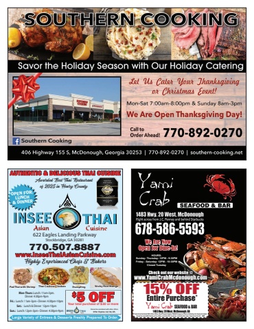 Highly Experienced Chefs & BakersLarge Variety of Entrees & Desserts Freshly Prepared To Order.Mon-Thurs: Lunch: 11am-3pm.Dinner: 4:30pm-9pmFri.: Lunch: 11am-3pm %u2022 Dinner: 4:30pm-10pmSat.: Lunch & Dinner 12pm-10pmSun.: Lunch: 12pm-3pm %u2022 Dinner: 4:30pm-9pm622 Eagles Landing ParkwayStockbridge, GA 30281770.507.8887www.InseeThaiAsianCuisine.comPad Thai with Shrimp Thai Cashew Chicken Sticky Rice MangoSteamedDumpling$Your total purchase of $30 or more5 OFF Cannot be combined with other offers.Offer Expires 12/31/25.OPEN FOR:LUNCH& DINNERAUTHENTIC & DELICIOUS THAI CUISINEAwarded Best Thai Restaurant of 2025 in Henry CountyWe Are NowOpen for Dine-In!HOURS:Sunday- Thursday: 12PM - 9:30PMFriday - Saturday: 12PM - 10:30PMClosed Tuesday*Cannot be Combined With Other Offers. Must Present Original TSHNET Coupon at Time of Ordering. No Copies Accepted. Cannot be Used With Parties of 6 or More. Limit One Per Customer. Limit One Per order. Expires 12/31/25. TSN15% OFFEntire Purchase*Yami Crab SEAFOOD & BAR1483 Hwy. 20 West, McDonough, GACheck out our website @www.YamiCrabMcdonough.com