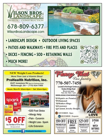 %u2022 LANDSCAPE DESIGN %u2022 OUTDOOR LIVING SPACES %u2022 PATIOS AND WALKWAYS %u2022 FIRE PITS AND PLACES%u2022 DECKS %u2022 FENCING %u2022 SOD %u2022 RETAINING WALLS %u2022 MUCH MORE!678-809-6377WilsonBrosLandscape.comHours: Mon-Fri 10am-6pm %u2022 Sat 10am-5pm$5 OFFAny Purchase of $25 or MoreOffer Expires 12/31/25ProHealth Nutrition, Inc.2107 Jonesboro Rd (Next to Firehouse Subs)McDonough, GA %u2022 (770) 914-7955More Than Just a Vitamin Shop!NEW Weight Loss Products!%u2022$30 Foot Detox%u2022Allergy Help%u2022Pain - Curamin%u2022Weight Loss - Spark%u2022Life ExtensionFancy That Fancy That Fine Jewelry$700WATCHBATTERIES1 PER CUSTOMERFREEJEWELRYCLEANINGWith Coupon. 2 Pieces Per Coupon.$50 OFFPURCHASE OF $250Must present coupon. Exp. 12/31/25.Not valid with other offers.$25 OFFPURCHASE OF $150Must present coupon. Exp. 12/31/25.Not valid with other offers.FALL INLOVEwith something special!NOVEMBER - TopazDECEMBER - TurquoiseDiscount applies only to list priceand in-store merchandise. Discount applies only to list priceand in-store merchandise.Repairs on Premises DiamondsMothers Rings LayawaysCustom Jewelry Designs770-507-7458Located in the Kroger Center onHudson Bridge RoadWe are now open Tues.-Sat. 10am - 5 pmWWW.AFANCYTHATJEWELRY.COM
