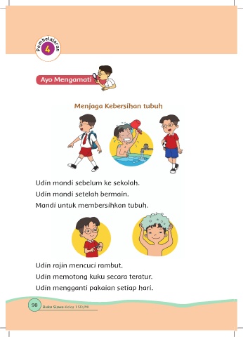 Menjaga Kebersihan tubuh Udin mandi sebelum ke sekolah. Udin mandi setelah bermain. Mandi untuk membersihkan tubuh. Udin rajin mencuci rambut. Udin memotong kuku secara teratur. Udin mengganti pakaian setiap hari. 98 Buku Siswa Kelas 1 SD/MI