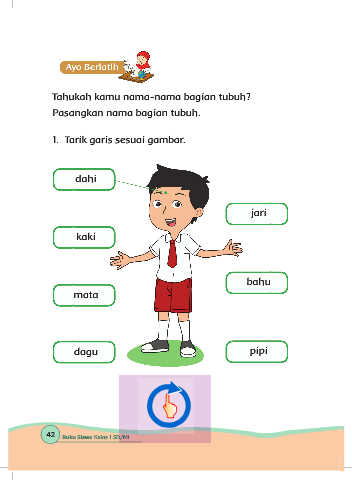 Tahukah kamu nama-nama bagian tubuh? Pasangkan nama bagian tubuh. 1. Tarik garis sesuai gambar. dahi jari kaki bahu mata dagu pipi 42 Buku Siswa Kelas 1 SD/MI