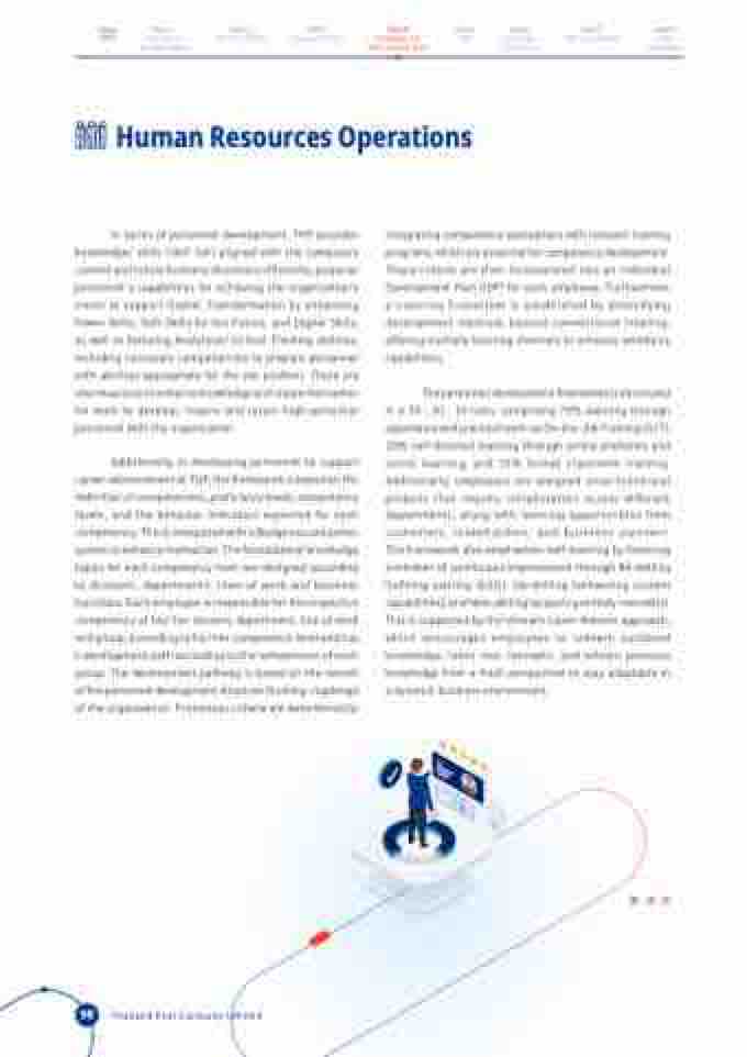 The personnel development framework is structured in a 70 : 20 : 10 ratio, comprising 70% learning through experience and practical work via On-the-Job Training (OJT), 20% self-directed learning through online platforms and social learning, and 10% formal classroom training. Additionally, employees are assigned cross-functional projects that require collaboration across different departments, along with learning opportunities from customers, stakeholders, and business partners. The framework also emphasizes self-learning by fostering a mindset of continuous improvement through Re-skilling (refining existing skills), Up-skilling (enhancing current capabilities), and New-skilling (acquiring entirely new skills). This is supported by the Unlearn-Learn-Relearn approach, which encourages employees to unlearn outdated knowledge, learn new concepts, and relearn previous knowledge from a fresh perspective to stay adaptable in a dynamic business environment.