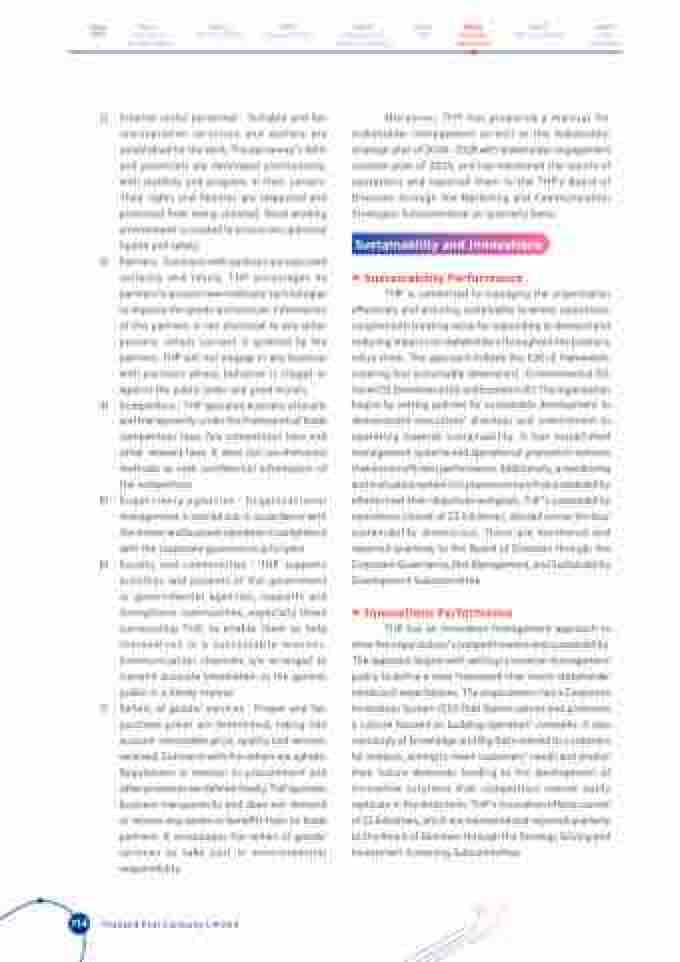 3) Partners : Contracts with partners are executed correctly and timely. THP encourages its partners to present new methods/ technologies to improve the goods and services. Information of the partners is not disclosed to any other persons, unless consent is granted by the partners. THP will not engage in any business with partners whose behavior is illegal or against the public order and good morals.