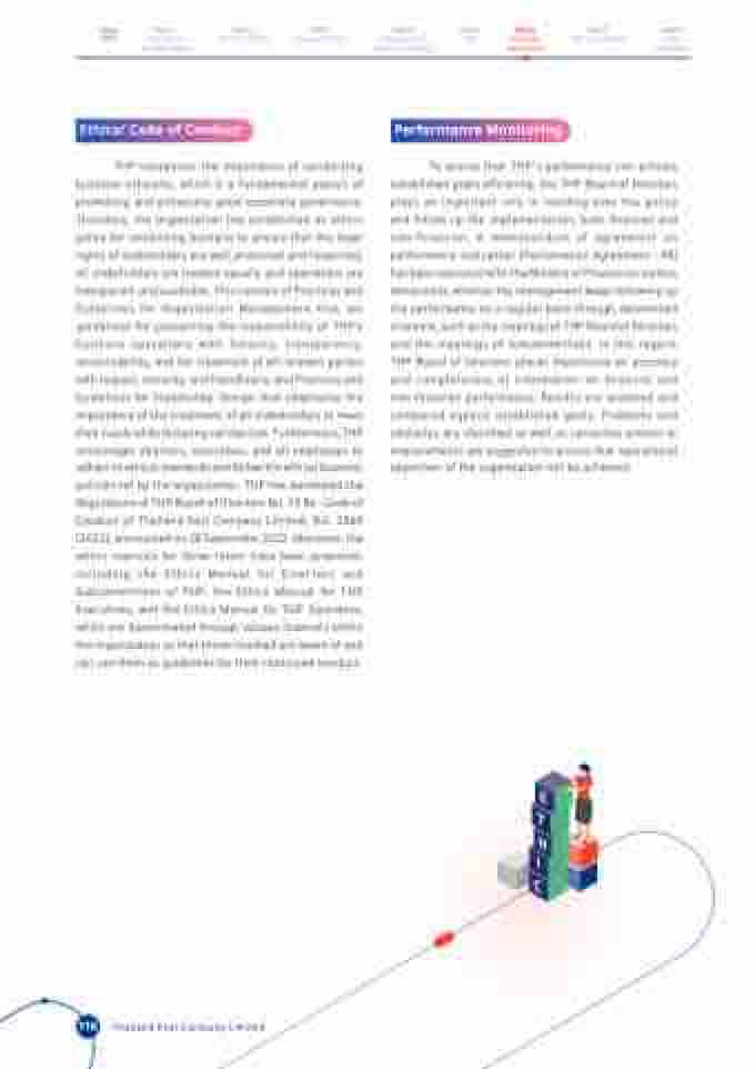 THP recognizes the importance of conducting business ethically, which is a fundamental aspect of promoting and enhancing good corporate governance. Therefore, the organization has established an ethics policy for conducting business to ensure that the legal rights of stakeholders are well protected and respected, all stakeholders are treated equally and operations are transparent and auditable. This consists of Practices and Guidelines for Organization Management that set guidelines for presenting the responsibility of THP's business operations with honesty, transparency, accountability, and fair treatment of all relevant parties with respect, sincerity, and friendliness; and Practices and Guidelines for Stakeholder Groups that emphasize the importance of the treatment of all stakeholders to meet their needs while fostering satisfaction. Furthermore, THP encourages directors, executives, and all employees to adhere to ethical standards and follow the ethical business policies set by the organization. THP has developed the Regulations of THP Board of Directors No. 15 Re : Code of Conduct of Thailand Post Company Limited, B.E. 2565 (2022), announced on 28 September 2022. Moreover, the ethics manuals for three levels have been prepared, including the Ethics Manual for Directors and Subcommittees of THP, the Ethics Manual for THP Executives, and the Ethics Manual for THP Operators, which are disseminated through various channels within the organization so that those involved are aware of and can use them as guidelines for their continued conduct.