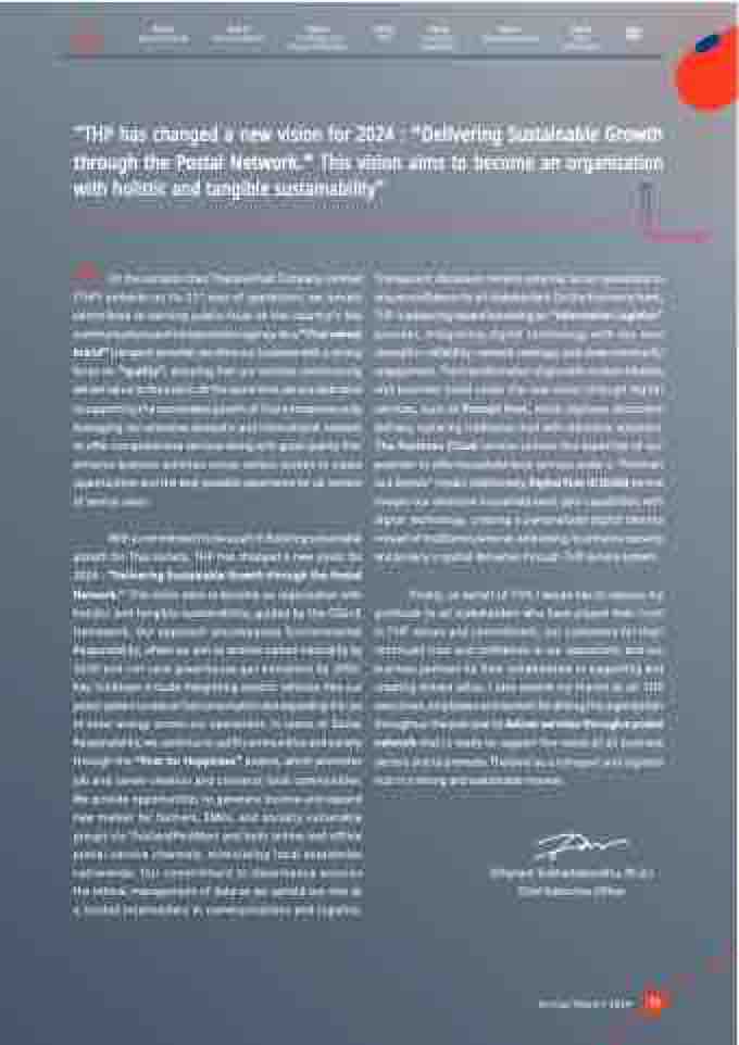 Finally, on behalf of THP, I would like to express my gratitude to all stakeholders who have placed their trust in THP values and commitment, our customers for their continued trust and confidence in our operations, and our business partners for their collaboration in supporting and creating shared value. I also extend my thanks to all THP executives, employees and workers for driving the organization throughout the past year to deliver services through a postal network that is ready to support the needs of all business sectors and to promote Thailand as a transport and logistics hub in a strong and sustainable manner.