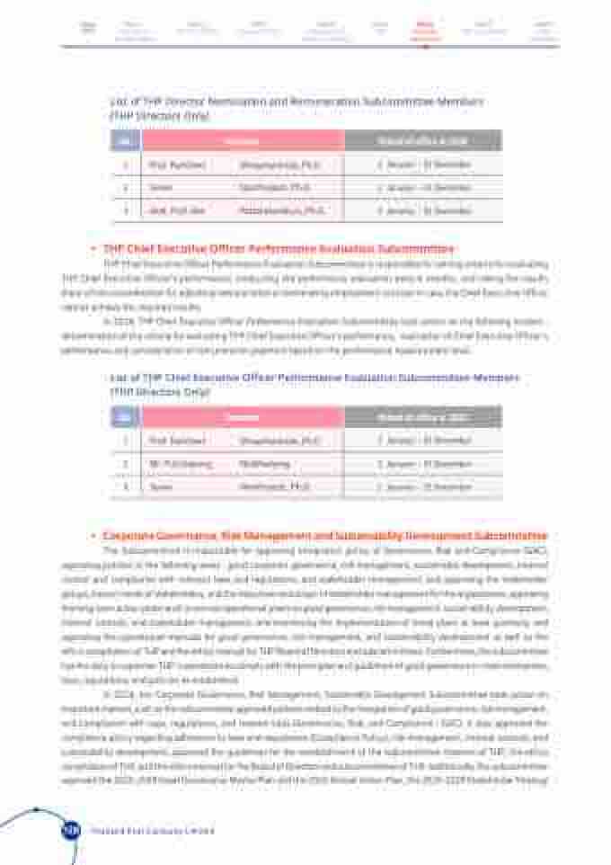 In 2024, the Corporate Governance, Risk Management, Sustainable Development Subcommittee took action on important matters, such as the subcommittee approved policies related to the integration of good governance, risk management, and compliance with laws, regulations, and related rules (Governance, Risk, and Compliance : GRC). It also approved the compliance policy regarding adherence to laws and regulations (Compliance Policy), risk management, internal controls, and sustainability development; approved the guidelines for the establishment of the subcommittee charters of THP, the ethics compilation of THP, and the ethics manual for the Board of Directors and subcommittees of THP. Additionally, the subcommittee approved the 2025-2029 Good Governance Master Plan and the 2025 Annual Action Plan, the 2025-2029 Stakeholder Strategy