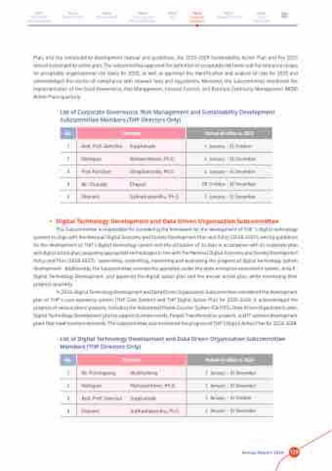 The Subcommittee is responsible for considering the framework for the development of THP ’s digital technology systems to align with the National Digital Economy and Society Development Plan and Policy (2018-2037); setting guidelines for the development of THP’s digital technology system and the utilization of its data in accordance with its corporate plan and digital action plan; proposing appropriate technologies in line with the National Digital Economy and Society Development Policy and Plan (2018-2037); supervising, controlling, monitoring and evaluating the progress of digital technology system development. Additionally, the subcommittee oversaw the operation under the state enterprise assessment system, Area 5 : Digital Technology Development, and approved the digital action plan and the annual action plan, while monitoring their progress quarterly.