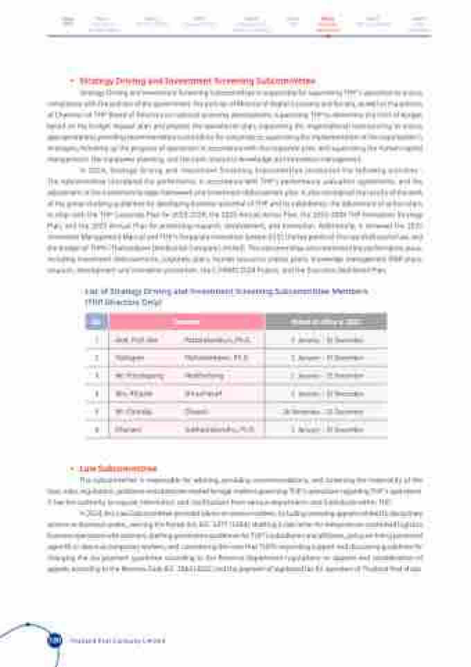 In 2024, Strategy Driving and Investment Screening Subcommittee conducted the following activities : The subcommittee considered the performance in accordance with THP’s performance evaluation agreements, and the adjustment of the investment budget framework and investment disbursement plan. It also considered the results of the work of the group studying guidelines for developing business potential of THP and its subsidiaries, the adjustment of action plans to align with the THP Corporate Plan for 2025-2029, the 2025 Annual Action Plan, the 2025-2029 THP Innovation Strategy Plan, and the 2025 Annual Plan for promoting research, development, and innovation. Additionally, it reviewed the 2025 Innovation Management Manual and THP’s Corporate Innovation System (CIS), the key points of the new draft postal law, and the budget of THPD (Thailandpost Distribution Company Limited). The subcommittee also monitored key performance areas, including investment disbursements, corporate plans, human resources master plans, knowledge management (KM) plans, research, development and innovation promotion, the C-FIRMS 2024 Project, and the Executive Dashboard Plan.