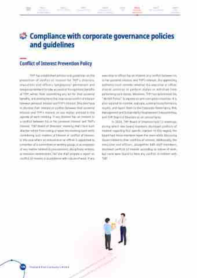 executive or officer has an interest or a conflict between his or her personal interest and THP's interest, the appointing authority must consider whether the executive or officer should continue to perform duties or withdraw from performing such duties. Moreover, THP has determined the “No Gift Policy” to express an anti-corruption intention. It is also required to monitor, evaluate, summarize performance results, and report them to the Corporate Governance, Risk Management and Sustainability Development Subcommittee and THP Board of Directors on an annual basis.