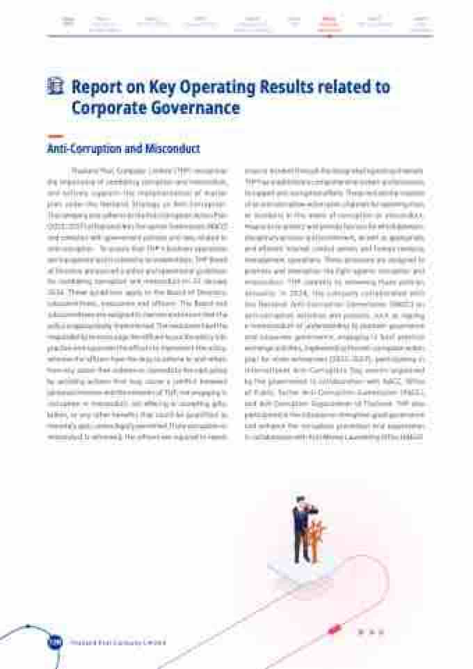 clues or incident through the designated reporting channels. THP has established a comprehensive system and processes to support anti-corruption efforts. These include the creation of an anti-corruption action plan, channels for reporting clues or incidents in the event of corruption or misconduct, measures to protect and provide fairness for whistleblowers, disciplinary process and punishment, as well as appropriate and efficient internal control system and human resource management operations. These processes are designed to promote and strengthen the fight against corruption and misconduct. THP commits to reviewing these policies annually. In 2024, the company collaborated with the National Anti-Corruption Commission (NACC) on anti-corruption activities and projects, such as signing a memorandum of understanding to promote governance and corporate governance, engaging in best practice exchange activities, implementing the anti-corruption action plan for state enterprises (2023–2027), participating in International Anti-Corruption Day events organized by the government in collaboration with NACC, Office of Public Sector Anti-Corruption Commission (PACC), and Anti-Corruption Organization of Thailand. THP also participated in the initiative to strengthen good governance and enhance the corruption prevention and suppression in collaboration with Anti-Money Laundering Office (AMLO).