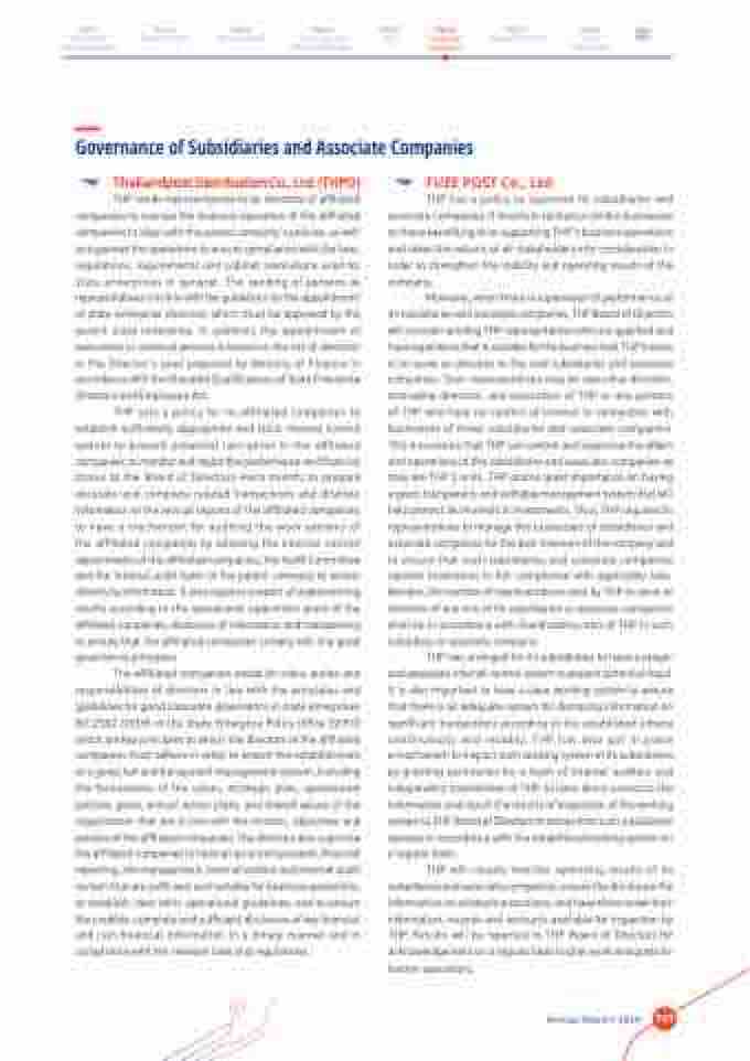 The affiliated companies establish roles, duties and responsibilities of directors in line with the principles and guidelines for good corporate governance in state enterprises B.E.2562 (2019) of the State Enterprise Policy Office (SEPO) which are key principles to which the directors of the affiliated companies must adhere in order to ensure the establishment of a good, fair and transparent management system, including the formulation of the vision, strategic plan, operational policies, goals, annual action plans, and shared values of the organization that are in line with the mission, objectives and policies of the affiliated companies. The directors also supervise the affiliated companies to have an accounting system, financial reporting, risk management, internal control and internal audit system that are sufficient and suitable for business operations, to establish clear ethic operational guidelines, and to ensure the credible, complete and sufficient disclosure of key financial and non-financial information in a timely manner and in compliance with the relevant laws and regulations.
