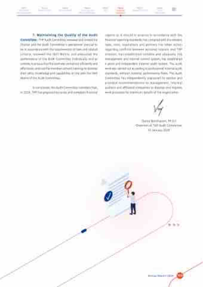 7. Maintaining the Quality of the Audit Committee : THP Audit Committee reviewed and revised the Charter and the Audit Committee’s operational manual to be in accordance with the requirements of laws and related criteria; reviewed the Skill Matrix; and evaluated the performance of the Audit Committee individually and as a whole, to ensure that the work was carried out efficiently and effectively; and had the members attend trainings to develop their skills, knowledge and capabilities in line with the Skill Matrix of the Audit Committee.