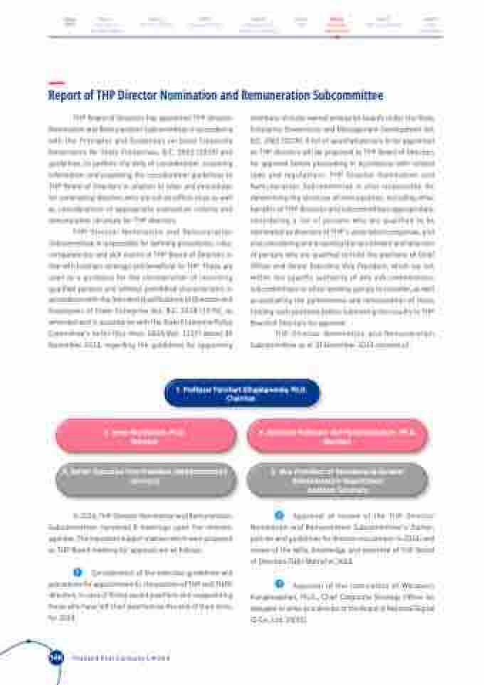 members of state-owned enterprise boards under the State Enterprise Governance and Management Development Act B.E. 2562 (2019). A list of qualified persons to be appointed as THP directors will be proposed to THP Board of Directors for approval before proceeding in accordance with related laws and regulations. THP Director Nomination and Remuneration Subcommittee is also responsible for determining the structure of remuneration, including other benefits of THP directors and subcommittees appropriately, considering a list of persons who are qualified to be nominated as directors of THP’s associated companies, and also considering and screening the recruitment and selection of persons who are qualified to hold the positions of Chief Officer and Senior Executive Vice President, which are not within the specific authority of any sub-commissions, subcommittees or other working groups to consider, as well as evaluating the performance and remuneration of those holding such positions before submitting the results to THP Board of Directors for approval.