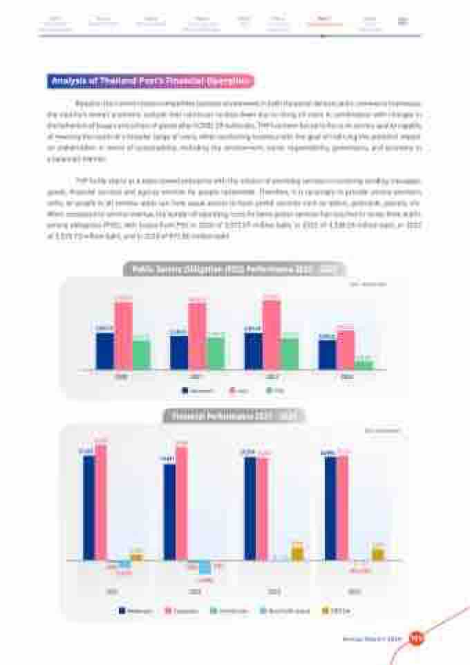 THP holds status as a state-owned enterprise with the mission of providing services in receiving-sending messages, goods, financial services and agency services for people nationwide. Therefore, it is necessary to provide service provision units, so people in all remote areas can have equal access to basic postal services such as letters, postcards, parcels, etc. When compared to service revenue, the burden of operating costs for basic postal services has resulted in losses from public service obligation (PSO), with losses from PSO in 2020 of 3,072.07 million baht, in 2021 of 3,336.16 million baht, in 2022 of 3,319.73 million baht, and in 2023 of 971.80 million baht.