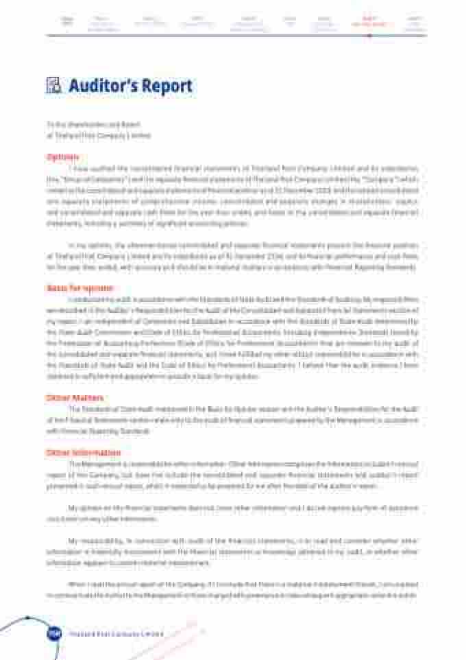 I have audited the consolidated financial statements of Thailand Post Company Limited and its subsidiaries (the “Group of Companies”) and the separate financial statements of Thailand Post Company Limited (the “Company”) which comprise the consolidated and separate statements of financial position as at 31 December 2024, and the related consolidated and separate statements of comprehensive income, consolidated and separate changes in shareholders’ equity, and consolidated and separate cash flows for the year then ended, and notes to the consolidated and separate financial statements, including a summary of significant accounting policies.
